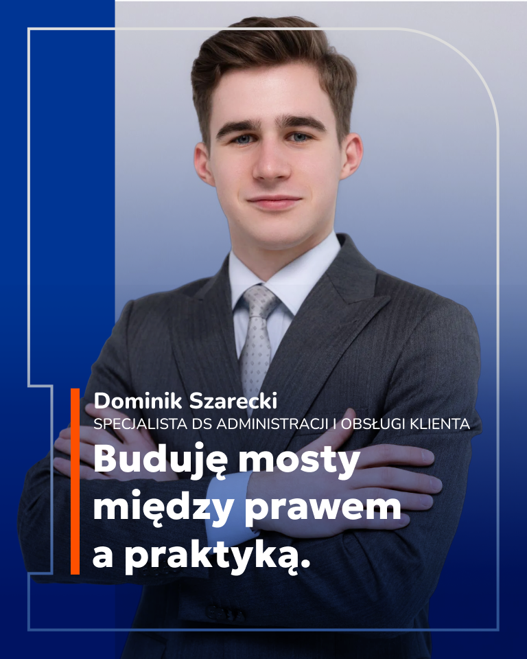Połączenie studiów prawniczych na UWr z praktyką w naszym zespole pozwala mu budować fundamenty pod zawód radcy prawnego. Dla Dominika liczy się autentyczny rozwój – taki, który teorię z podręczników zamienia w realne wsparcie dla naszych Klientów.