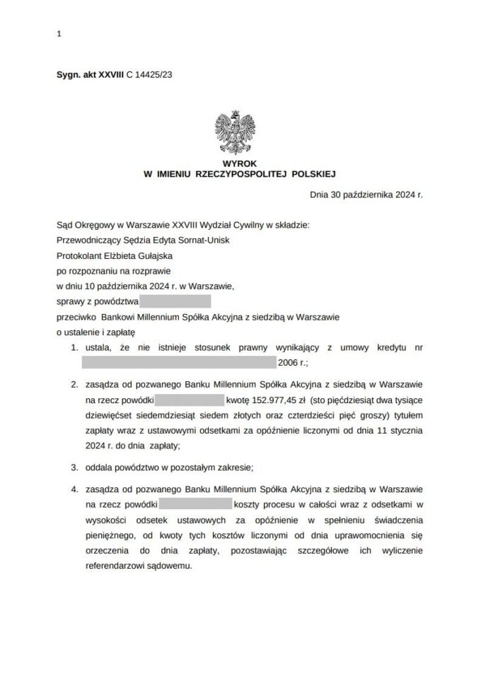 • zasądził od Banku Millennium kwotę 152 977,45 zł wraz z odsetkami za opóźnienie