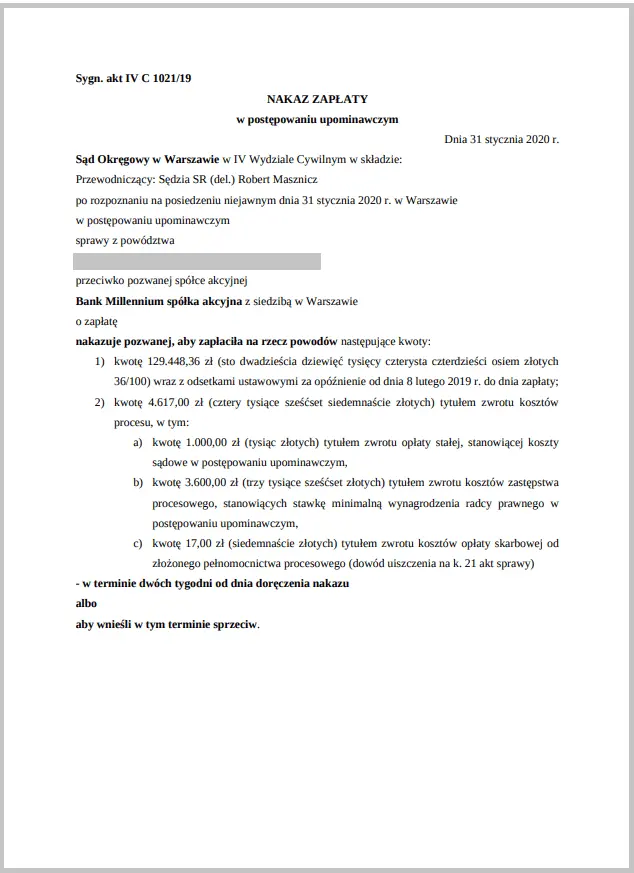Decyzją Sądu Okręgowego w Warszawie z dn. 31 stycznia 2020 r. w sprawie naszych Klientów vs. Bank Millennium S.A. otrzymaliśmy nakaz zapłaty.