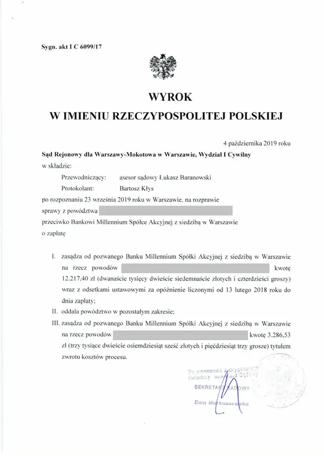 W dniu 4 października 2019 r. Sąd Rejonowy dla Warszawy – Mokotowa w Warszawie na skutek złożonego przez nasze Centrum pozwu o zapłatę zasądził dla naszych Klientów kwotę 12 217,40 zł nadpłaty.
