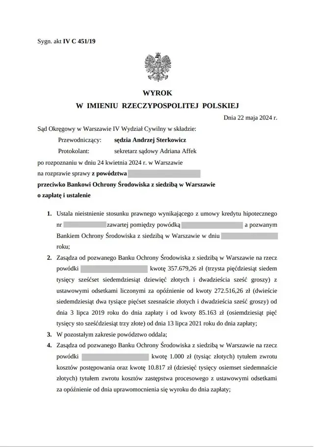• Zasądził od Banku Ochrony Środowiska S.A. na rzecz kredytobiorców kwotę 357 679,26 zł (trzysta pięćdziesiąt siedem tysięcy sześćset siedemdziesiąt dziewięć złotych i dwadzieścia sześć groszy) z ustawowymi odsetkami za opóźnienie od kwoty 272 516,26 zł od dnia 3 lipca 2019 roku do dnia zapłaty i od kwoty 85 163 zł od dnia 13 lipca 2021 roku do dnia zapłaty.