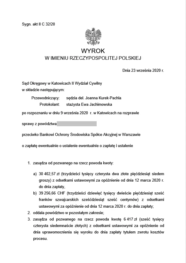 W dniu 23 września 2020 r. Sąd Okręgowy w Katowicach II Wydział Cywilny unieważnił umowę naszych Klientów zawartą z Bankiem Ochrony Środowiska S. A., tj. umowę kredytu denominowanego, na zasadzie dwóch kondykcji. W wyroku sąd zasądził na rzecz naszych Klientów kwotę w wysokości 30.402,57 PLN oraz kwotę 39.256,60 CHF.