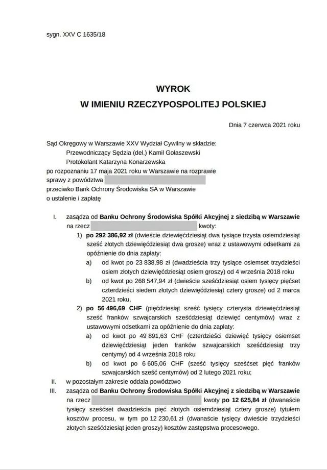 Szczegóły wyroku: W dniu 7 czerwca 2021 r. Sąd Okręgowy w Warszawie XXV Wydział Cywilny wydał wyrok (sygnatura akt XXV C 1635/18) w którym unieważnił w całości umowę kredytu denominowanego (stwierdzenie nieważności umowy) naszych Klientów (zawartą z BOŚ S.A. w 2006 r.). Sąd zasądził od Pozwanego na rzecz dwóch współkredytobiorców kwoty po 292 386, 92 zł oraz kwoty po 56 496, 69 CHF wraz z odsetkami. Oznacza to wygraną łącznie ponad milion złotych w jednej sprawie.
