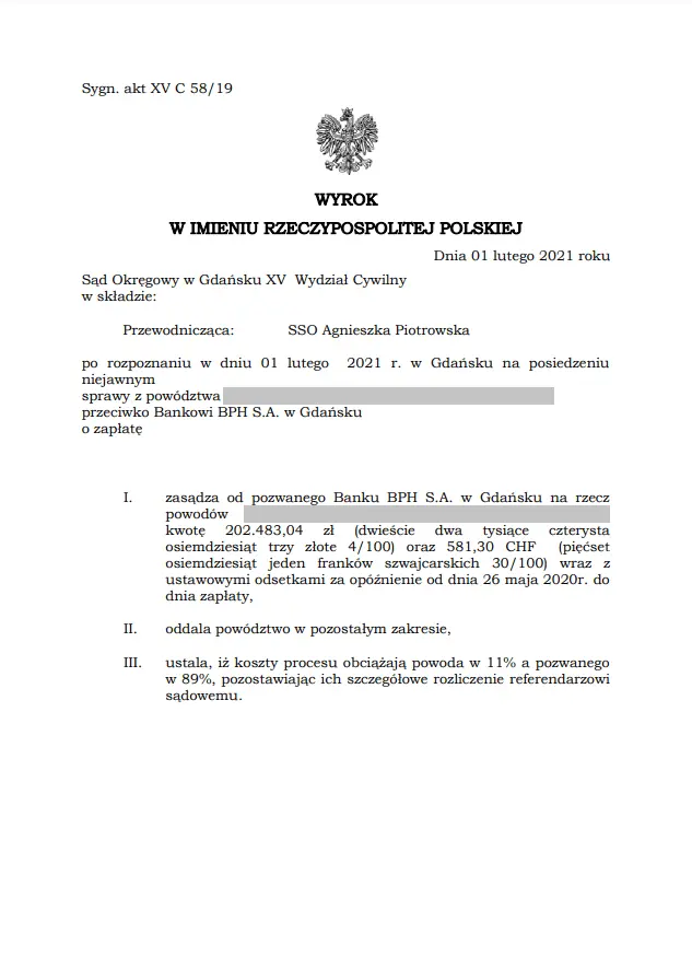 W dniu 01 lutego 2021 r. Sąd Okręgowy w Gdańsku XV Wydział Cywilny wydał wyrok na posiedzeniu niejawnym, w którym zasądził od Pozwanego na rzecz Powoda kwotę 202.483,04 zł oraz 581,30 CHF wraz z ustawowymi odsetkami.