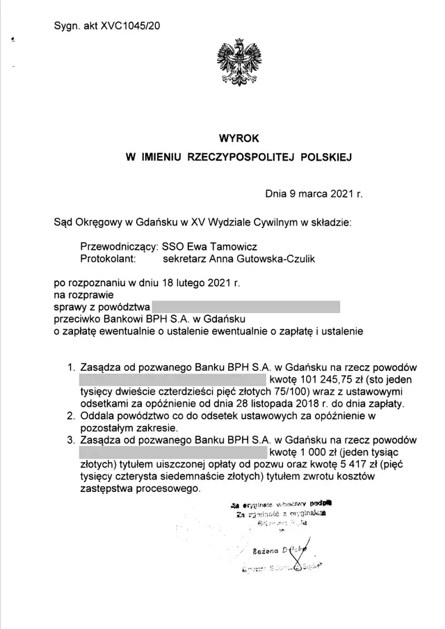 Wygrana sprawa z Bankiem BPH S.A. (umowa pierwotnie podpisana z dawnym bankiem GE Money Bank S.A.) w Sądzie Okręgowym w Gdańsku XV Wydział Cywilny. Sąd zasądził na rzecz Powodów kwotę 101 245,75 zł wraz z ustawowymi odsetkami za opóźnienie od dnia 28 listopada 2018 roku do dnia zapłaty. Sąd uznał umowę za nieważną z uwagi na zawarte w niej klauzule niedozwolone. W ocenie Sądu umowa bez nieważnych postanowień nie może być wykonywana, wobec czego należało orzec zgodnie z żądaniem pozwu.