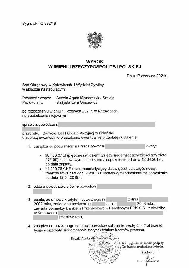 Sąd Okręgowy w Katowicach wydał wyrok, w którym zasądził od Pozwanego banku na rzecz naszych Klientów kwotę 58.733,07 zł oraz 14.990,76 CHF wraz z ustawowymi odsetkami