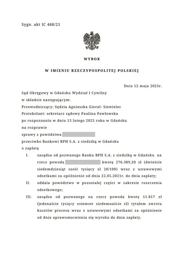 • Bank BPH S.A. musi zwrócić naszemu Klientowi 276 389,20 zł wraz z odsetkami liczonymi od 22 maja 2021 r.