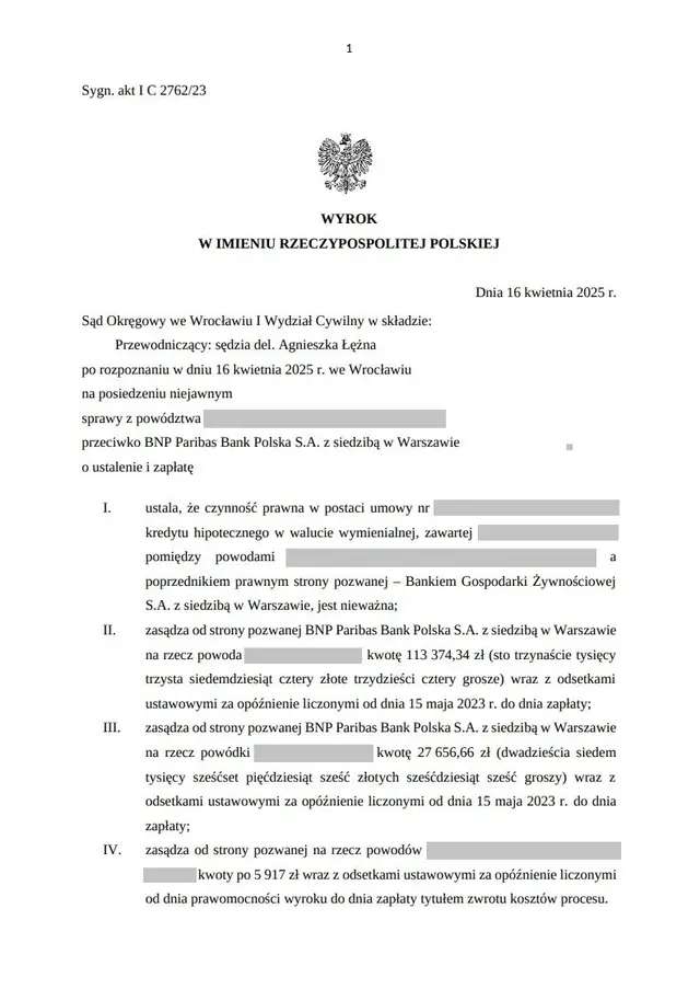 16 kwietnia 2025 roku Sąd Okręgowy we Wrocławiu wydał wyrok, który potwierdził nasze racje. To zwycięstwo sprawiedliwości i potwierdzenie, że nasze innowacyjne rozwiązania oraz indywidualne podejście do każdej sprawy przynoszą wymierne efekty. Udało nam się: