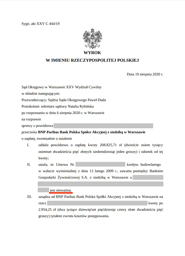 Sąd Okręgowy w Warszawie XXV Wydział Cywilny unieważnił umowę kredytu denominowanego naszych Klientów, zawartą z bankiem BGŻ S.A. (obecnie BNP Paribas Bank Polska S.A.).