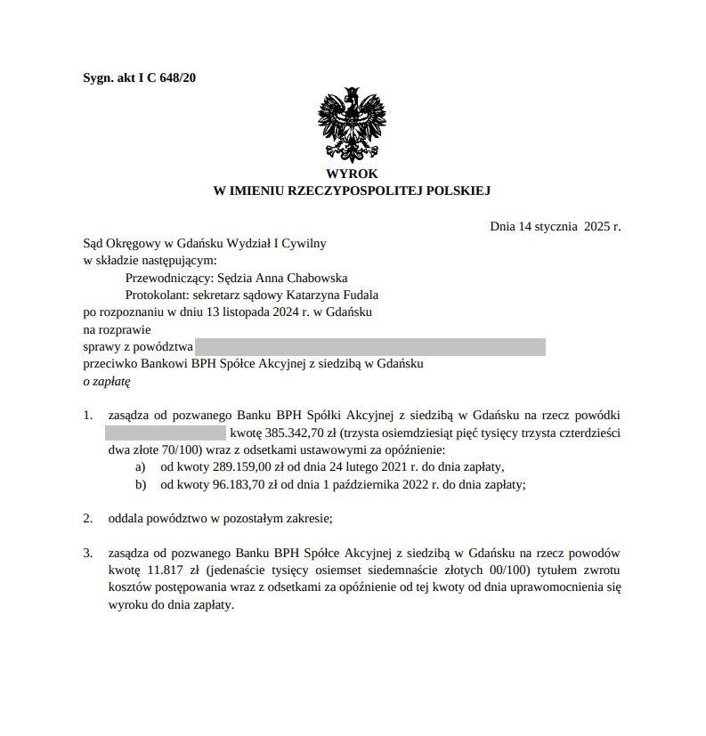 • Sąd zasądził od Banku BPH S.A. na rzecz naszej Klientki kwotę 385 342,70 zł wraz z odsetkami liczonymi od 24 lutego 2021 roku (dla większości kwoty) oraz od 1 października 2022 roku (dla pozostałej części).