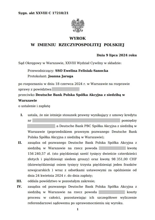 - Zasądzenie od Deutsche Bank Polska S.A. kwoty 156 240,57 zł oraz kwotę 98 351,00 CHF wraz z ustawowymi odsetkami