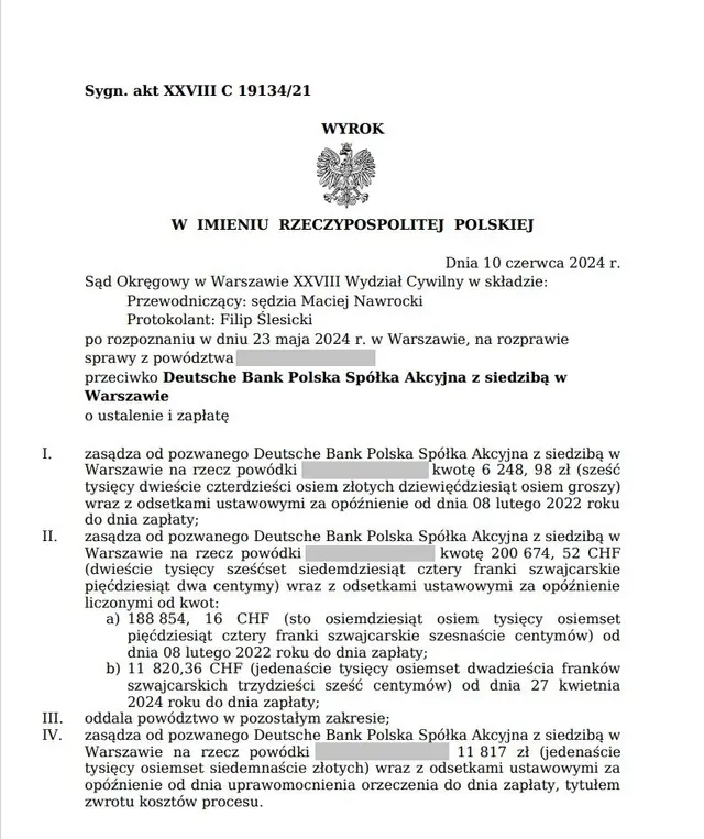 - Zasądza spektakularną sumę 200 674,52 CHF z odpowiednimi odsetkami – to równowartość ponad 900 000 złotych przy obecnym kursie franka!