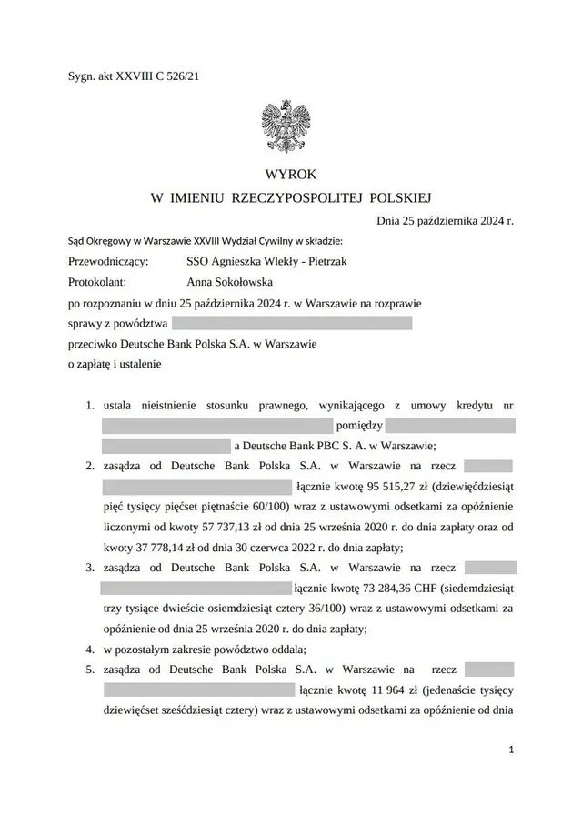 Deutsche Bank Polska S.A. znów przegrał w sądzie w spektakularny sposób! Tym razem chodziło o bardzo znaczące kwoty wyrażone zarówno w złotych, jak i frankach szwajcarskich. Nasza przemyślana strategia prawna po raz kolejny okazała się strzałem w dziesiątkę, przynosząc klientowi wielotysięczne korzyści finansowe.