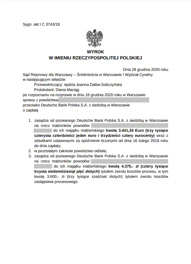 W dniu 28 grudnia 2020 Sąd Rejonowy dla Warszawy-Śródmieścia w Warszawie I Wydział Cywilny zasądził od banku na rzecz naszych Klientów kwotę 3.441,34 euro z odsetkami od 16.02.2018. do dnia zapłaty. Pozew na wokandzie w tej sprawie dotyczył zwrotu ubezpieczenia niskiego wkładu własnego (UNWW) doliczonego przez bank w umowie kredytu hipotecznego.