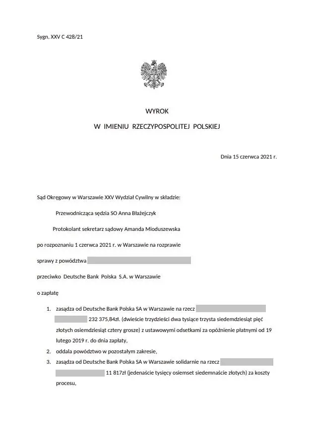 Szczegóły wyroku: W dniu 15 czerwca 2021 r. Sąd Okręgowy w Warszawie wydał wyrok (sygnatura akt XXV C 428/21), w którym zasądził od Deutsche Bank Polska S.A. na rzecz Powodów kwotę 232.375,84 zł z odsetkami (umowa pierwotnie zawarta z Deutsche Bank PBC S.A. w 2007 r.)