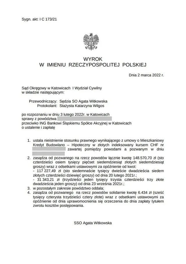 - Zasądził od ING Banku Śląskiego kwotę 148 570,70 zł wraz z ustawowymi odsetkami – znacząca kwota dla klienta