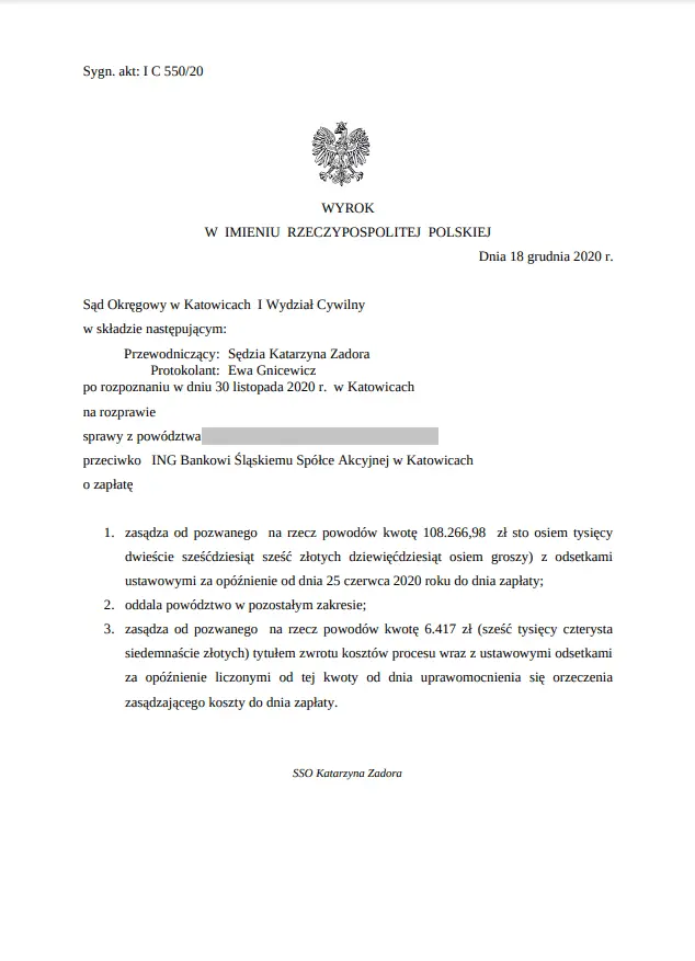 Sąd Okręgowy w Katowicach I Wydział Cywilny w dniu 18 grudnia 2020 r. wydał wyrok, w którym stwierdził nieważność umowy. Sąd zasądził od Pozwanego na rzecz Powoda kwotę 108 266, 98 zł z ustawowymi odsetkami.