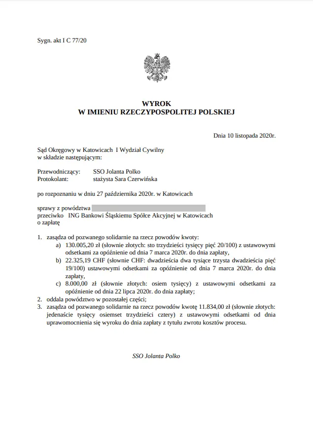 W dniu 10 października 2020 r. Sąd Okręgowy w Katowicach I Wydział Cywilny doprowadził do unieważnienia umowy kredytu naszych Klientów z bankiem ING Bank Śląski S.A.