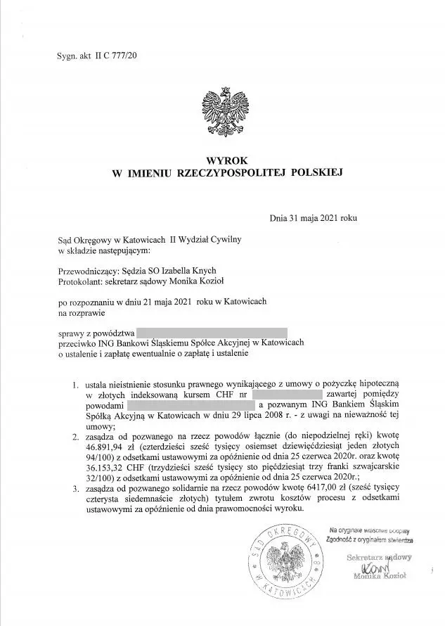 Szczegóły wyroku: W dniu 31.05.2021 r. Sąd Okręgowy w Katowicach ogłosił wyrok, w którym ustalił nieistnienie stosunku prawnego wynikającego z umowy o pożyczkę hipoteczną w zł indeksowaną do CHF (umowa zwarta z ING Bankiem Śląskim S.A. w 2008 r.) z uwagi na jej nieważność. Zasądził od pozwanego (banku) na rzecz naszych Klientów kwotę 46.891,94 PLN oraz kwotę 36.153,32 CHF z odsetkami ustawowymi (łącznie ok. 195.000 zł z odsetkami).