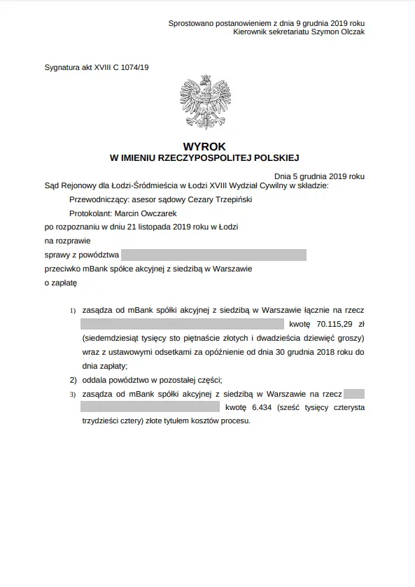 Sąd Rejonowy dla Łodzi XVIII Wydział Cywilny zasądził na rzecz naszych Klientów od banku mBank kwotę 70.115,29 zł wraz z odsetkami oraz kosztami zastępstwa. Sąd ustalił nieważność poszczególnych postanowień umowy w przedmiocie mechanizmów waloryzacji kredytu.