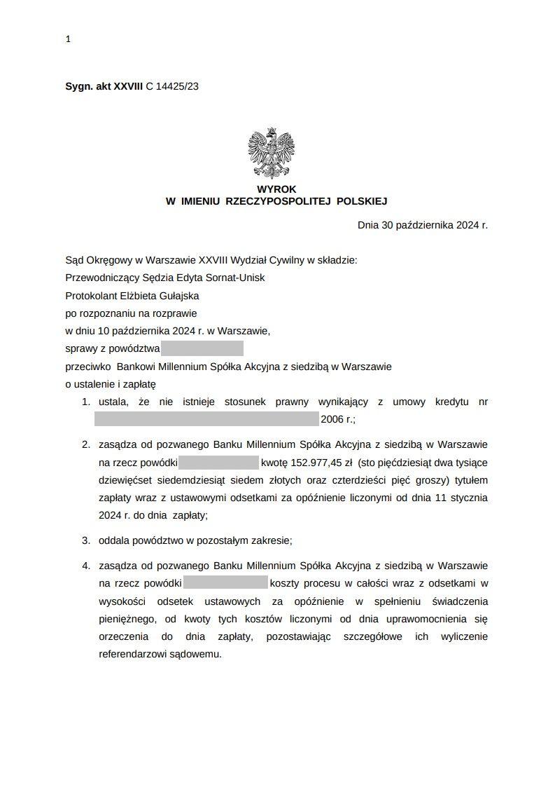 • zasądził od Banku Millennium kwotę 152 977,45 zł wraz z odsetkami za opóźnienie