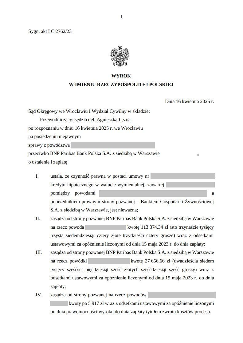 • Zasądzić od BNP Paribas Bank Polska S.A. na rzecz Klientki kwotę 113 374,34 zł wraz z ustawowymi odsetkami za opóźnienie liczonymi od dnia 15 maja 2023 r. do dnia zapłaty.