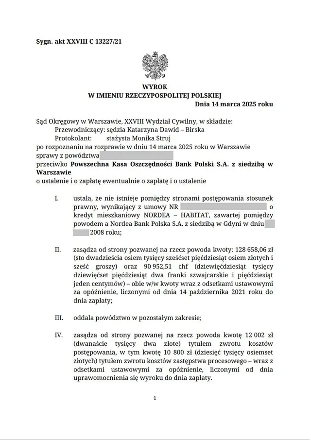 Czy wciąż macie wątpliwości, że walka z PKO BP S.A. może zakończyć się sukcesem? Ten wyrok definitywnie je rozwiewa. 14 marca 2025 roku Sąd Okręgowy w Warszawie wydał kolejny przełomowy wyrok na naszą korzyść, potwierdzając skuteczność naszych metod prawnych w sporach z największym bankiem w Polsce.