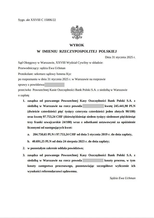 Zastanawiacie się, czy walka z największym bankiem w Polsce ma sens? Czy istnieje realna szansa na odzyskanie niesłusznie pobranych pieniędzy od PKO BP S.A.? Dziś prezentujemy kolejny spektakularny dowód na to, że nasze doświadczenie i determinacja przynoszą wymierne rezultaty. To kolejny przełomowy wyrok w naszej walce z bankami. Sprawa ta pokazuje, że nawet potężna instytucja jak PKO BP S.A. musi liczyć się z konsekwencjami swoich działań. Wyrok zapadł 31 stycznia 2025 roku w Sądzie Okręgowym w Warszawie i stanowi kamień milowy w ochronie praw kredytobiorców frankowych.