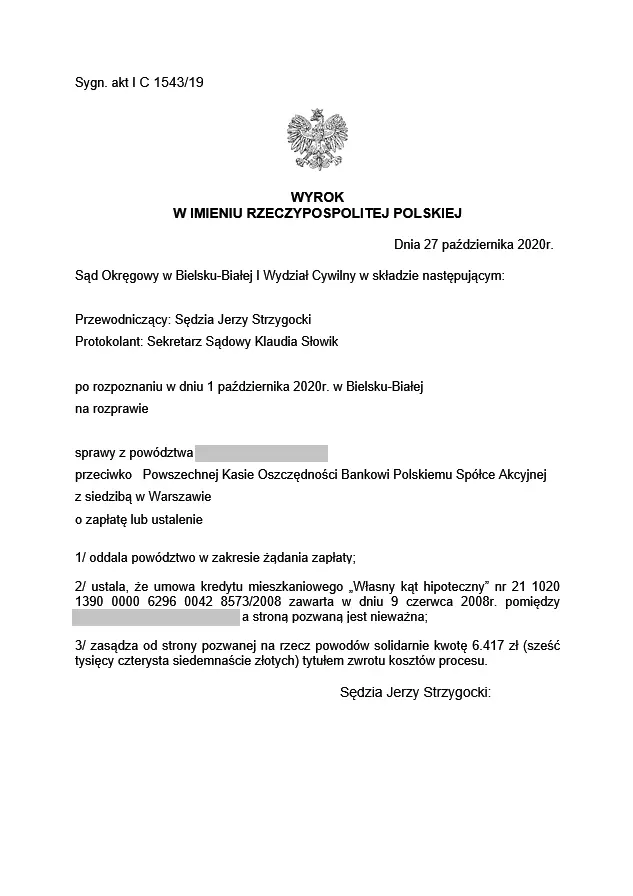 W dniu 27 października 2020 r. Sąd Okręgowy w Bielsku-Białej I Wydział Cywilny całkowicie unieważnił umowę kredytu denominowanego w CHF naszych klientów w sprawie przeciwko bankowi PKO BP S.A.