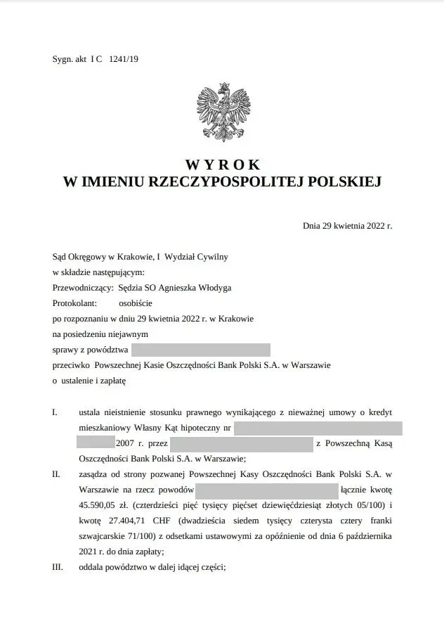 Sąd Okręgowy w Krakowie, I Wydział Cywilny w skladzie następującym: Przewodniczący: Sędzia SO Agnieszka Wlodyga Protokolant: osobiście po rozpoznaniu w dniu 29 kiviemia 2022 r. w Krakowie na posiedzeniu niejawnym sprawy z powództwa przeciwko Powszechnej Kasie Oszczędności Bank Polski S.A. w Warszawie o ustalenie i zapłatę