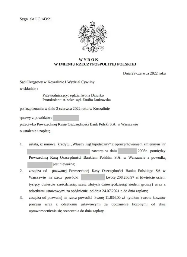 1. ustala, iż umowa kredytu „Własny Kąt hipoteczny” z oprocentowaniem zmiennym nr zawarta w dniu 2008r.. pomiędzy Powszechną Kasą Oszczędności Bankiem Polskim S.A. w Warszawie a powódką jest nieważna: 2. zasądza od pozwanej Powszechnej Kasy Oszczędności Banku Polskiego SA w Warszawie na rzecz powódki kwotę 208.266,97 zł (dwieście osiem tysięcy dwieście sześćdziesiąt sześć złotych dziewięćdziesiąt siedem groszy) wraz z odsetkami ustawowymi za opóźnienie od dnia 24.07.2021 r. do dnia zaplaty; 3. zasądza od pozwanej na rzecz powódki kwotę 11.834,00 zł tytułem zwrotu kosztów procesu wraz z odsetkami ustawowymi za opóźnienie liczonymi od dnia uprawomocnienia się orzeczenia do dnia zapłaty.