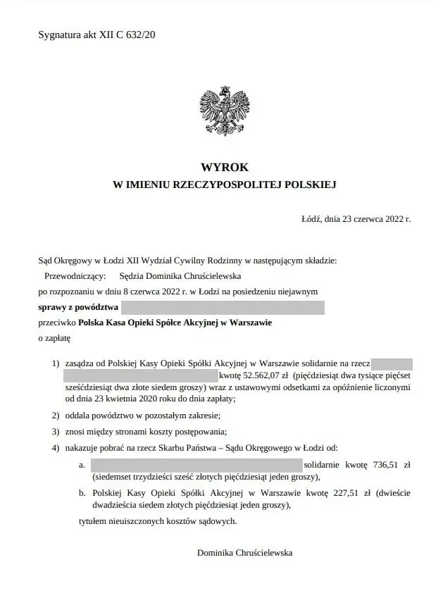 Sąd Okręgowy w Łodzi XII Wydział Cywilny Rodzinny w następującym składzie: Przewodniczący: Sędzia Dominika Chruścielewska po rozpoznaniu w dniu 8 czerwca 2022 r. w Łodzi na posiedzeniu niejawnym sprawy z powództwa przeciwko Polska Kasa Opieki Spółce Akcyjnej w Warszawie o zapłatę