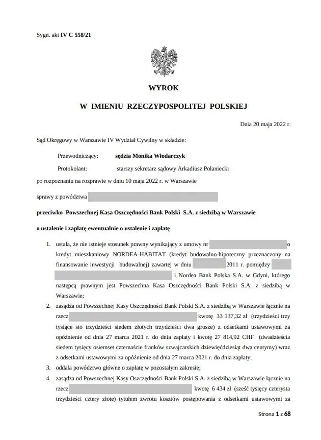 1. ustala, że nie istnieje stosunek prawny wynikający z umowy nr o kredyt mieszkaniowy NORDEA-HABITAT (kredyt budowaino-hipoteczny przeznaczony na finansowanie inwestycji budowalnej) zawartej w dniu 2011 r. pomiędzy Nordea Bank Polska S.A. w Gdyni, którego następcą prawnym Jest Powszechna Kasa Oszczędności Bank Polski S.A. z siedzibą w Warszawie;