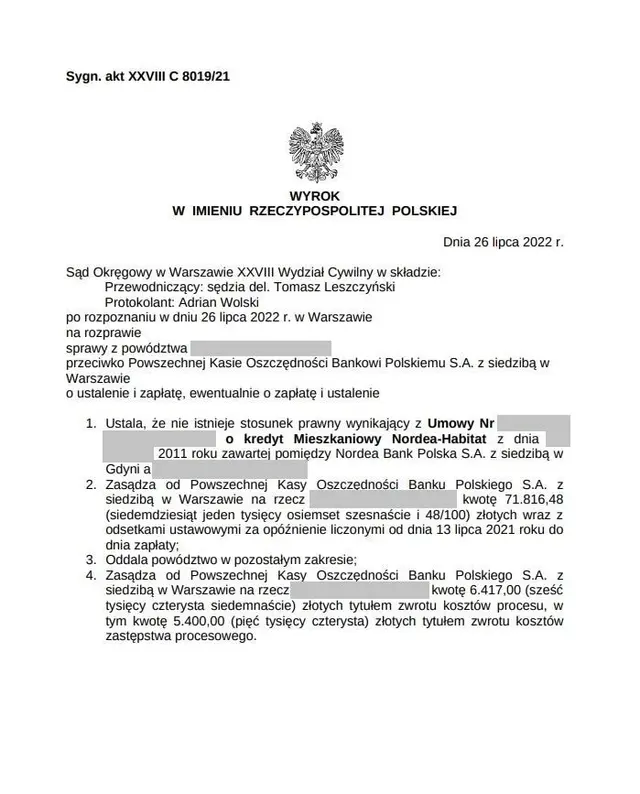 Sąd Okręgowy w Warszawie XXVIII Wydział Cywilny w składzie: Przewodniczący: sędzia del. Tomasz Leszczyński Protokolant: Adrian Wolski po rozpoznaniu w dniu 26 lipca 2022 r. w Warszawie na rozprawie sprawy z powództwa przeciwko Powszechnej Kasie Oszczędności Bankowi Polskiemu S.A. z siedzibą w Warszawie o ustalenie i zapłatę, ewentualnie o zapłatę i ustalenie