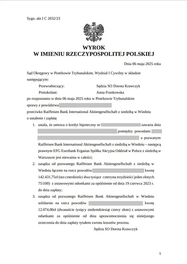 • Zasądziliśmy od pozwanego Raiffeisen Bank International AG S.A. z siedzibą w Wiedniu łącznie na rzecz powodów kwotę 142.431,75 zł (dokładnie czterdzieści dwa tysiące czterysta trzydzieści jeden złotych siedemdziesiąt pięć groszy) wraz z ustawowymi odsetkami za opóźnienie od dnia 19 czerwca 2023 r. do dnia zapłaty