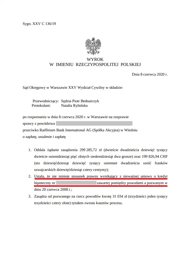 Wyrokiem Sąd Okręgowy w Warszawie XXV Wydział Cywilny z dn. 8 czerwca 2020 r. uwzględnił powództwo i ustalił nieistnienie stosunku prawnego wynikającego z umowy kredytu hipotecznego indeksowanego do CHF na kwotę 2.400.000,00 zł (dwa miliony czterysta tysięcy złotych).