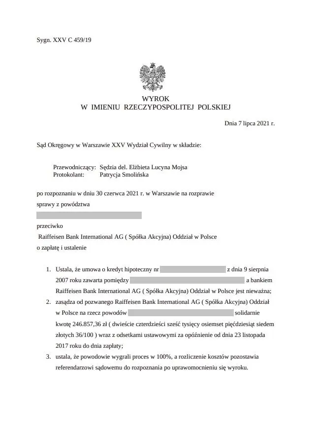 Sąd zasądził solidarnie od Banku na rzecz Kredytobiorców kwotę 246 857,36 zł (dwieście czterdzieści sześć tysięcy osiemset pięćdziesiąt siedem złotych 36/100). - Odsetki: