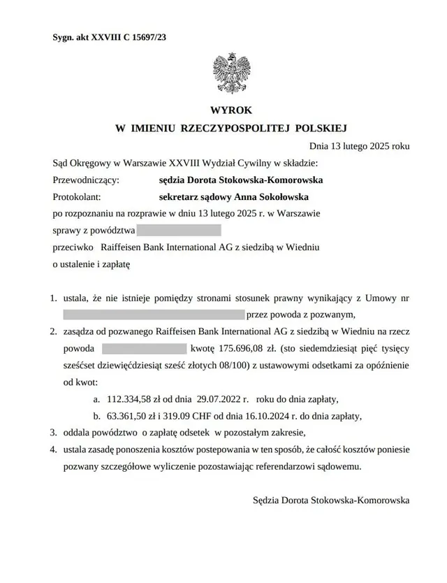 • Zasądzić od pozwanego Raiffeisen Bank International AG S.A. na rzecz powoda kwotę 175.696,08 zł wraz z ustawowymi odsetkami za opóźnienie, w tym 112.334,58 zł od dnia 29.07.2022 r. do dnia zapłaty oraz 63.361,50 zł i 319,09 CHF od dnia 16.10.2024 r. do dnia zapłaty