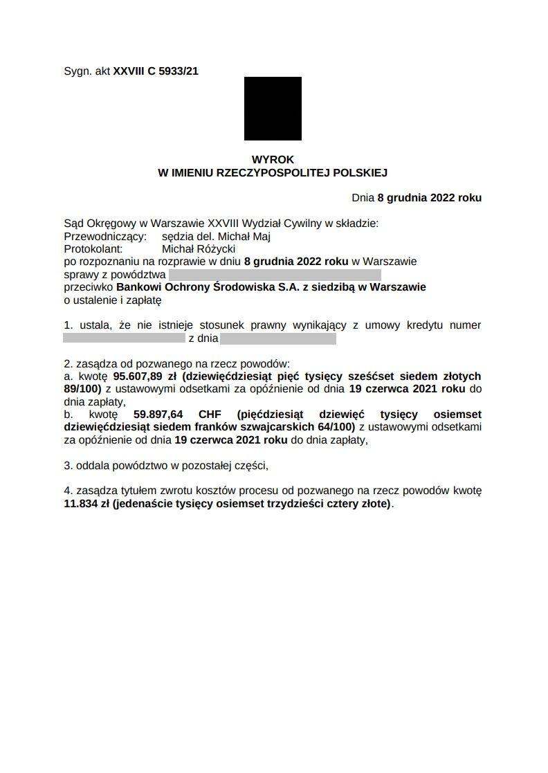 • Zasądził od Banku Ochrony Środowiska S.A. na rzecz kredytobiorców łącznie kwotę 95 607,89 zł oraz 59 897,64 CHF, wraz z ustawowymi odsetkami za opóźnienie, naliczanymi od 19 czerwca 2021 roku do dnia zapłaty.