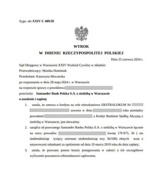 • Zasądził od banku kwotę 170 873,56 zł wraz z odsetkami ustawowymi za opóźnienie od dnia 19 marca 2019 roku do dnia zapłaty.