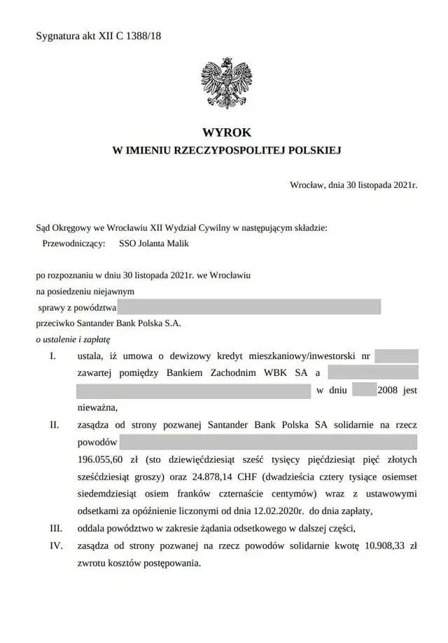 Strony Postępowania: Kredytobiorcy (Powodowie) przeciwko Bankowi (Pozwany – Santander Bank Polska S.A., następca prawny Banku Zachodniego WBK SA).