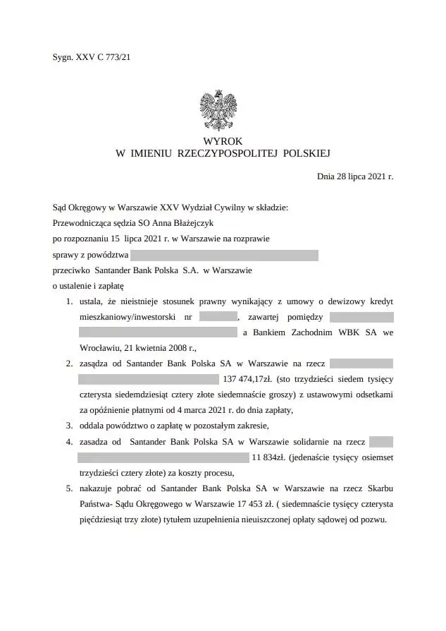 - Zasądzenie Kwoty: Sąd zasądził od Pozwanego Banku na rzecz Kredytobiorców kwotę 137 474,17 zł (sto trzydzieści siedem tysięcy czterysta siedemdziesiąt cztery złote siedemnaście groszy). Kwota ta została zasądzona wraz z ustawowymi odsetkami za opóźnienie płatnymi od 4 marca 2021 r. do dnia zapłaty.
