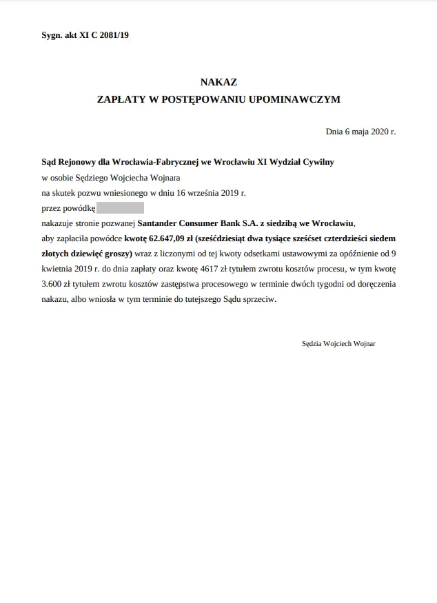 Decyzją Sądu Rejonowego dla Wrocławia-Fabrycznej we Wrocławiu XI Wydział Cywilny z dn. 06 maja 2020 r. w sprawie naszych Klientów vs. Santander Consumer Bank S.A. z siedzibą we Wrocławiu, otrzymaliśmy nakaz zapłaty. Oznacza to, że Bank ma obowiązek zapłacić na rzecz naszych Klientów 62 647, 09 zł – wraz z odsetkami od 09 kwietnia 2019 r.